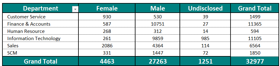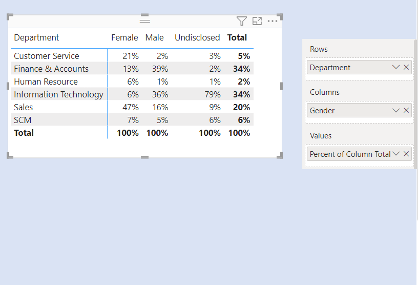 We want to calculate the percentage contribution of the columns. In our example the we want to calculate the percent contribution of gender across Department.