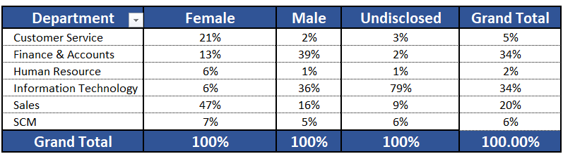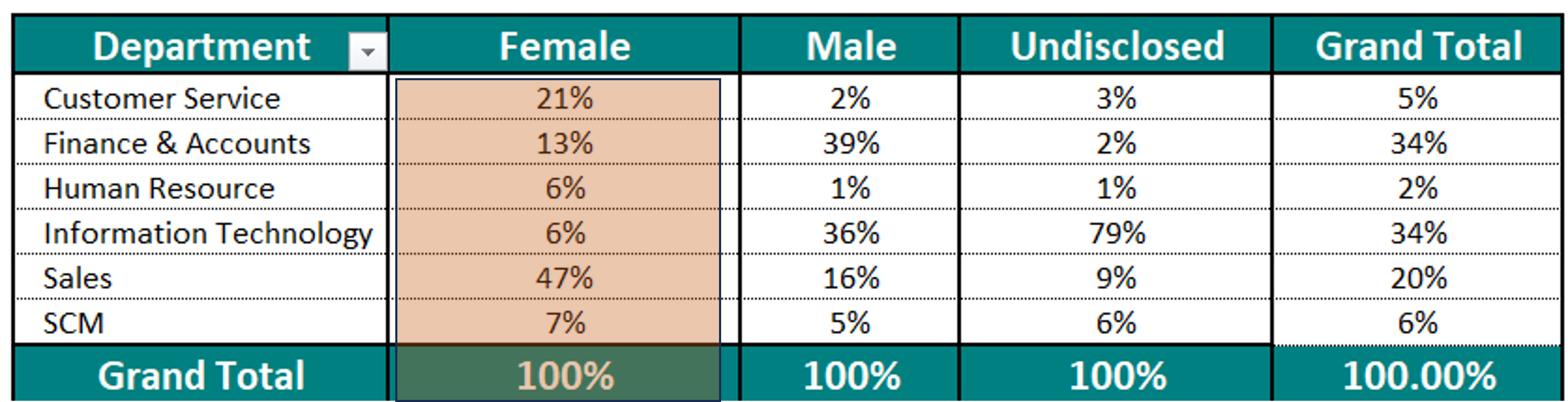 For percent of column total we need to find out the % values of female employees across Departments. The sum of all the values needs to be 100%